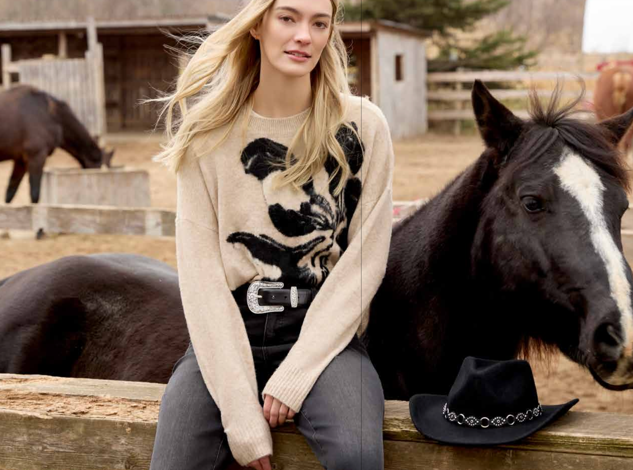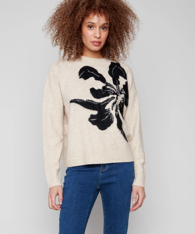 Enjoy the cozy elegance of this beige sweater featuring an abstract bold black floral pattern. Crafted from a soft material blend, it merges comfort with artistic style. Ribbed cuffs and a crew neck provide a classic touch, suitable for layering or wearing on its own. Great for both casual and smart outings, this sweater is an essential fall piece that keeps you warm in style.