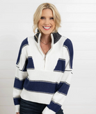 This Wide Stripe Half-Zip Sweater pairs wide, bold stripes with a crisp white panel featuring a sleek quarter zip, creating a fresh, structured look. The meet-and-greet length and long sleeves make it perfect for layering or standing out solo on cooler days.