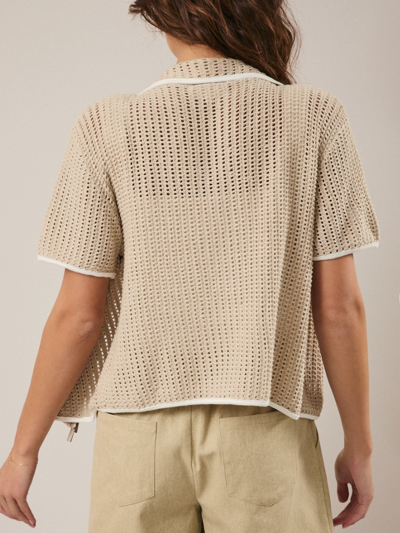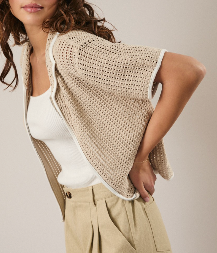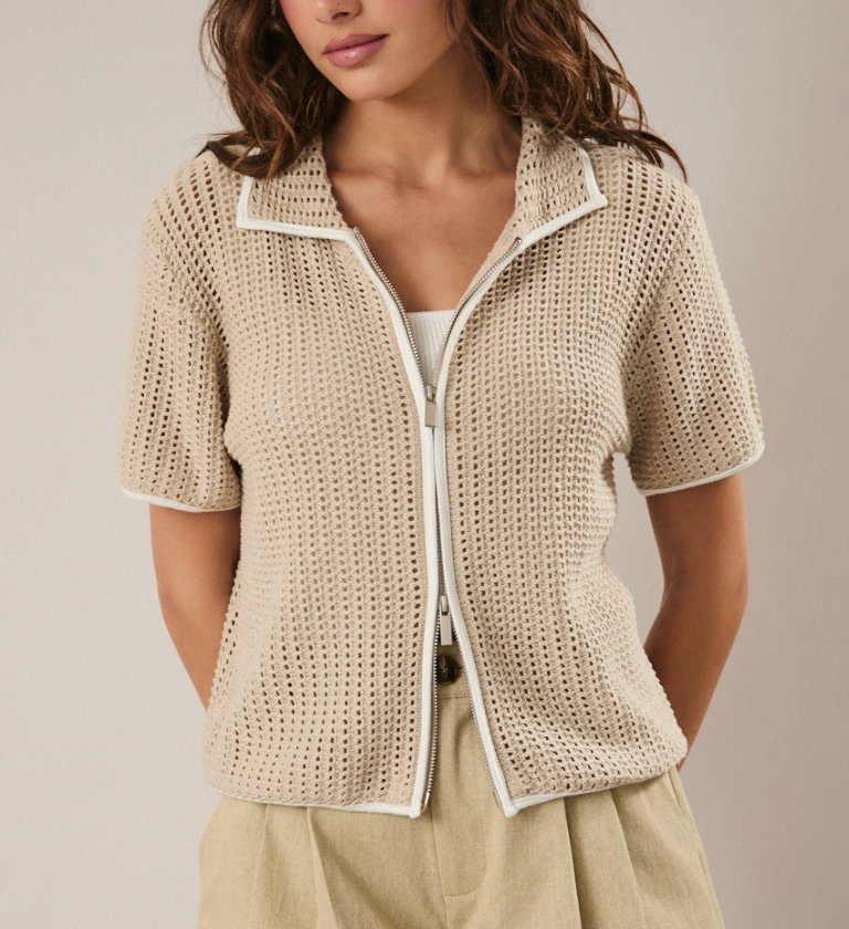 Zip Up Half Sleeve Open Knit Top